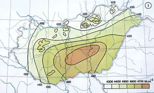 A térkép a napsugárzás évi összegét mutatja Magyarországon