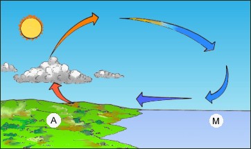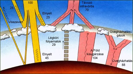 A légkörbe érkező energia mintegy 30 %-a visszaverődik a felszínről, a felhőkről és a légköri részecskékről. A fennmaradó 70 % elnyelődik a földfelszínen és a légkörben, ami azt jelenti, hogy kb. a sugárzás fele éri el a földfelszínt. Az elnyelt energiát a felszín és a légkör az infravörös tartományban sugározza vissza. Ezeknek a sugaraknak a zömét a felhők és az üvegházhatású gázok csapdába ejtik és visszasugározzák . A légkör hővisszatartó képessége az üvegházhatás, ami nélkül a földfelszín átlagos hőmérséklete a jelenlegi kb. +15 Celsius fok helyett -20 Celsius fok lenne. A légkör felmelegítéséhez a feláramlás és a felhőképződés is hozzájárul. Az ábrán "légköri folyamatok" néven szerepelnek az utóbbiak.
